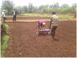 Earthing up is an important interculture operation in groundnut crop. It helps in higher pod formation as well as loosening of top soil. Manual earthing up is laborious and cumbersome operation. To introduce mechanization FLDs of Swastik hoe developed by Dr.B.S.K.K.V., Dapoli have been conducted at various farmers. Field capacity of the hoe is three times better than manual operation i.e. there is 60 % reduction in time required for earthing up. Also labour saving of upto 56 % has been observed.