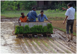 Transplanting is a labour intensive operation that adds substantially to the production cost in rice cultivation. Machine transplanting is an upcoming viable alternative to this problem faced by many farmers. Every Kharif season demonstrations of transplanter and mat nursery preparation are organized by the KVK on its instructional farm as well as at farmers’ fields. 3 acres of transplanting can be accomplished with the 8 row transplanter with the help of 3 semi-skilled labour.